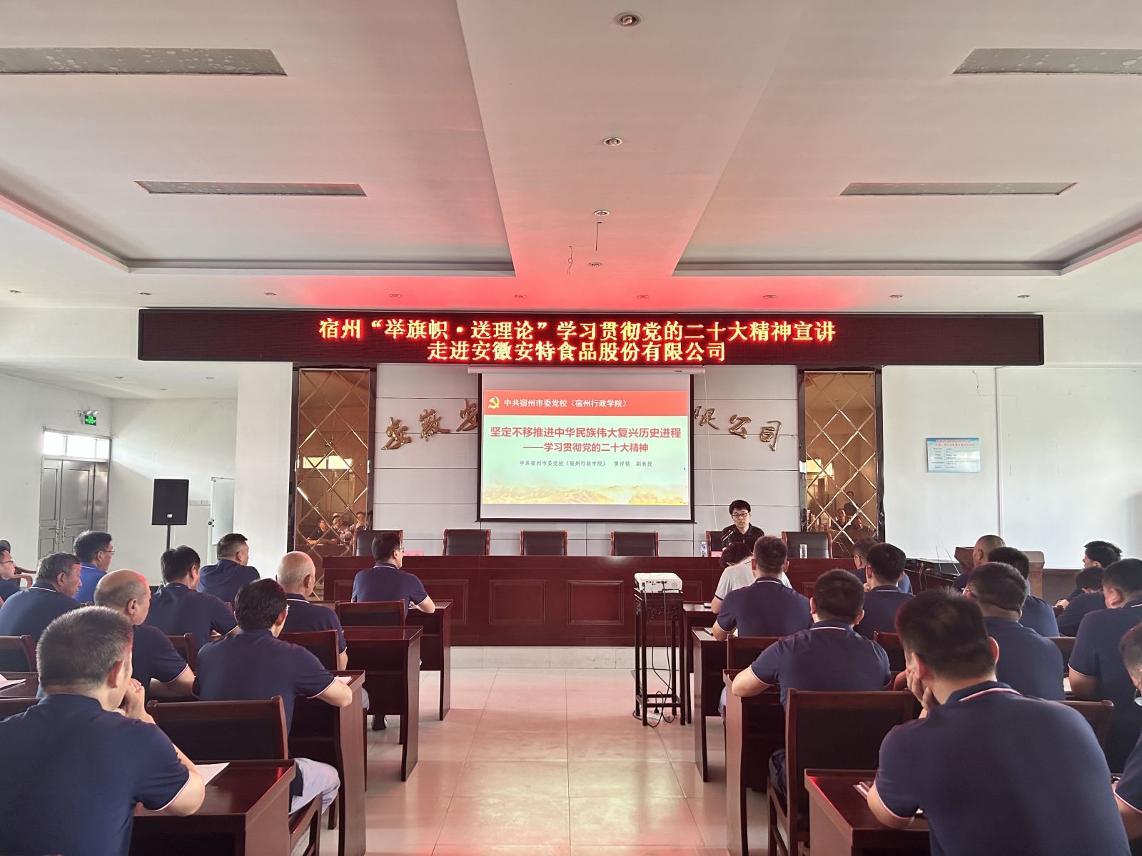 8月11日下午,宿州“舉旗幟·送理論”學(xué)習(xí)貫徹黨的二十大精神基層宣講報告會在安徽安特食品股份有限公司電教室召開。市委黨校理論研究室主任、副教授竇祥銘作專題宣講,市經(jīng)開區(qū)四級調(diào)研員、非公黨委副書記王浩主持會議。