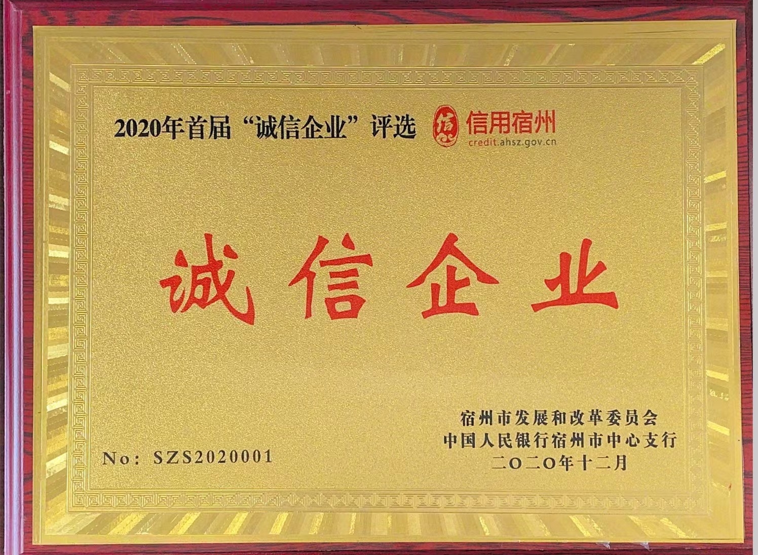 2022年6月21日,在宿州市信用協(xié)會工作推進會上,我司受邀參加“誠信企業(yè)”獎牌頒發(fā)儀式,獲得“宿州市誠信企業(yè)”榮譽。